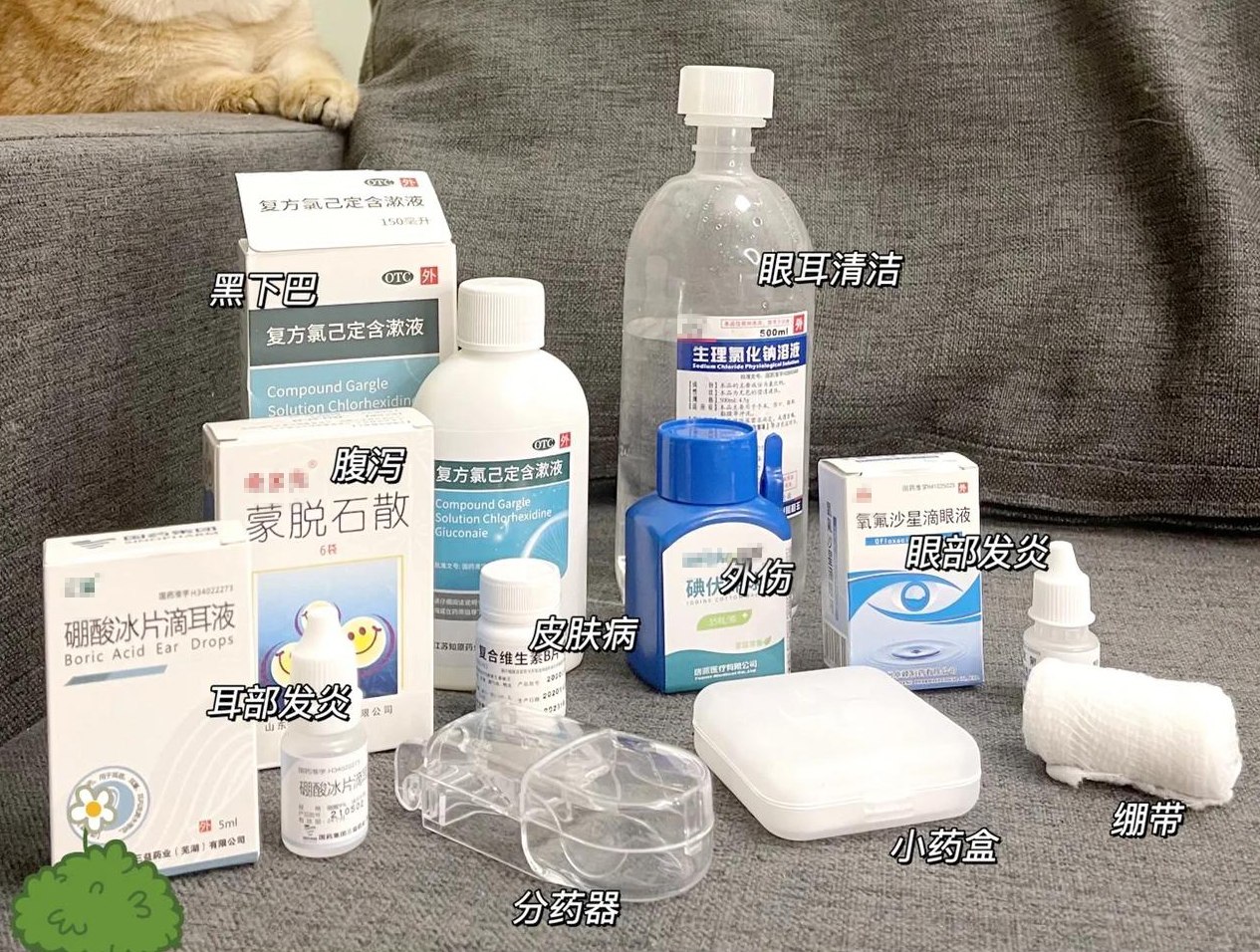 应急用品:纱布、碘伏、宠物常备药;